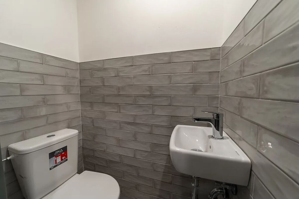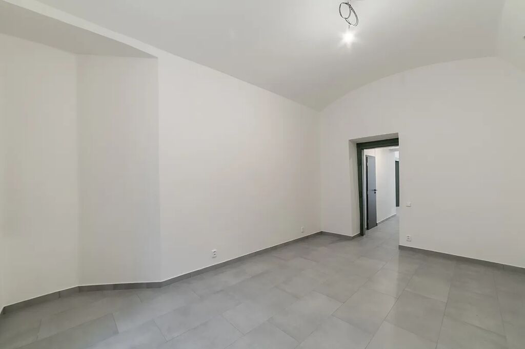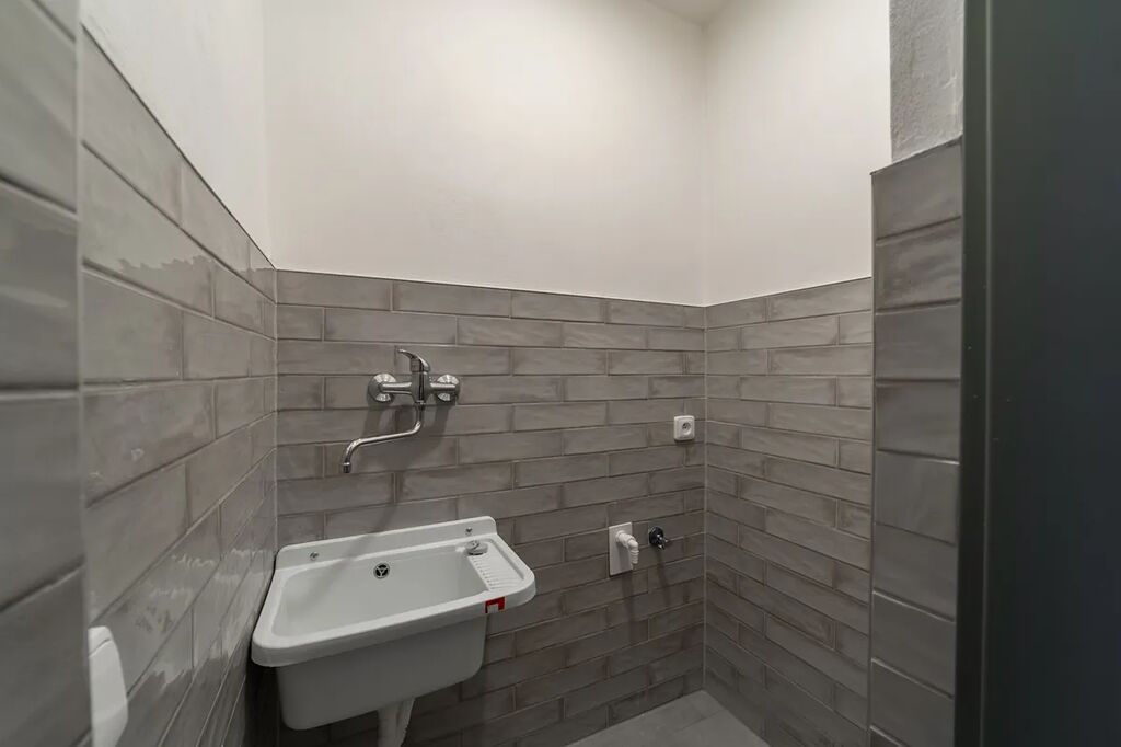 V této chvíli probíhá v prostoru rekonstrukce (nové dveře, topné radiátory, dlažba, elektroinstalace, malá kuchyňka, bojler, bílé stěny).