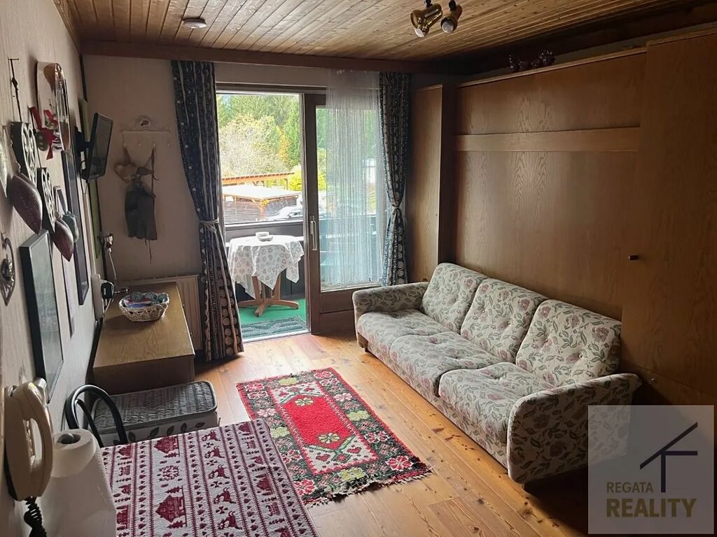 Obývací a spací část je efektivně řešena a nabízí vše, co potřebujete pro své každodenní potřeby, včetně integrovaného kuchyňského koutu. Vrcholem je balkon orientovaný na jih/západ s nádherným výhledem na okolní horskou krajinu – ideální pro vychutnání si klidu a pohody přírody.