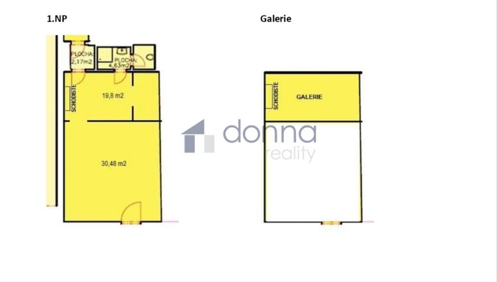 Nabízené prostory se nachází v přízemí budovy s vchodem a výlohami z ulice Šaldova. Prostory jsou aktuálně rozděleny příčkou na prodejní plochu o výměře 30,47 m2 a plochu kanceláře/skladu o výměře 19,8 m2. Zbylá plocha v 1. NP je tvořena zázemím (WC, sprcha) a chodbou. Do zadní části prostor je vestavěno patro – galerie o výměře 19,8 m2 s využitím např. jako sklad, za které nebude nájemci účtováno nájemné.