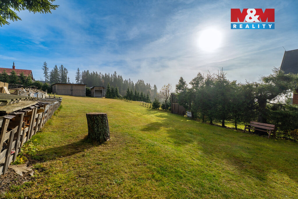 Dům 3+kk (48 m²) stojí na pozemku 795 m², má dvě terasy, dva balkony i hospodářské stavby. Po roce 2016 nové sítě: voda, kanalizace, elektro. Vytápění krbem a dálkově řízeným podlahovým topením. Součástí je sauna, kompletní vybavení i sněhová fréza.