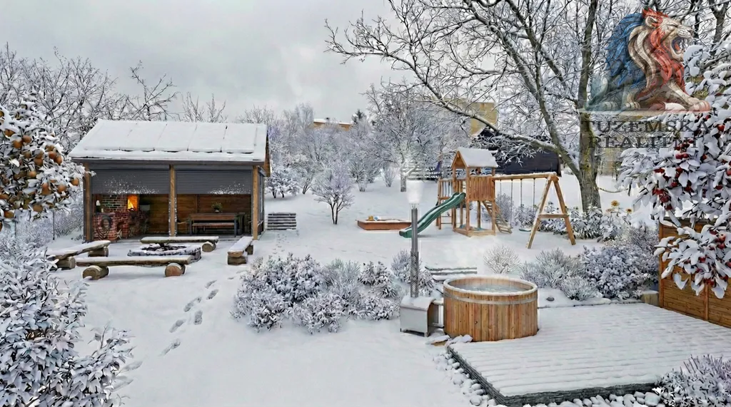Vize soukromého wellness: Pod korunami stávajících ořešáků je ideální místo pro koupací sud s topeništěm. Večer se naložíte do horké vody a pod hvězdami si užijete ticho, které v paneláku nenajdete.