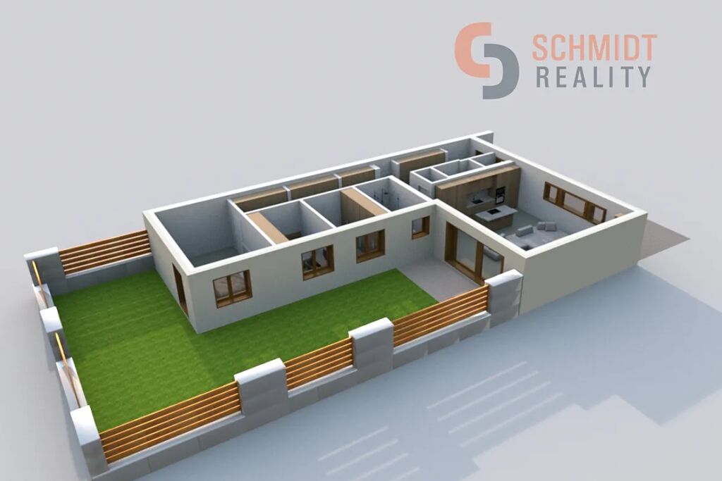 Dispozici domu tvoří zádveří, samostatná toaleta, technická místnost, spížírna, obývací pokoj s kuchyňským koutem, tři ložnice, koupelna (vana i sprcha).