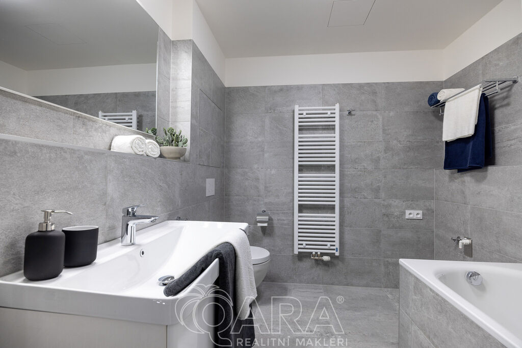 - koupelna s vanou, skleněnou zástěnou, umyvadlovou skříňkou a osvětleným zrcadlem,