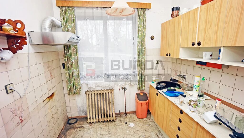 V kuchyni je původní kuchyňská linka bez sporáku a nerezová digestoř.