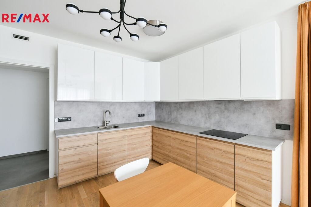 Byt je plně zařízený, jak můžete vidět na fotografiích. K dispozici je moderní kuchyňská linka se spotřebiči (lednice, mikrovlnná trouba, trouba, myčka, pračka), dále jídelní stůl se židlemi, postel s úložným prostorem a nočními stolky, a také pohovka.