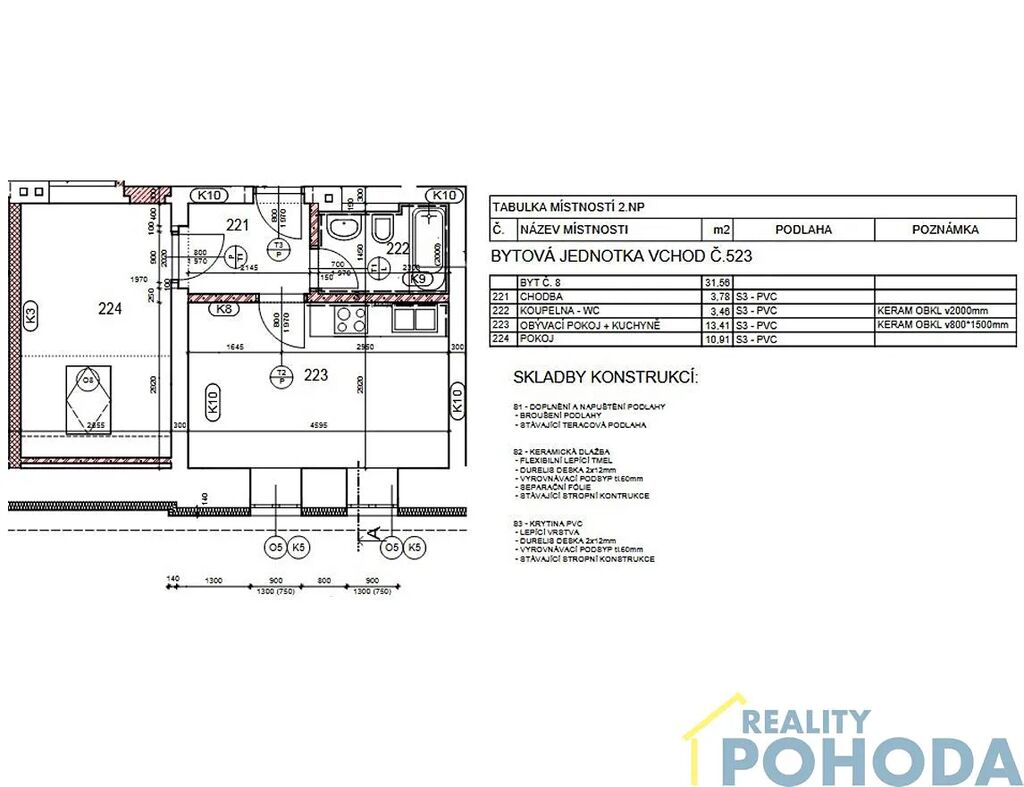 - Celková plocha bytů: 34,23 m2, 35,55 m2, 52,22 m2 a 56,65 m2