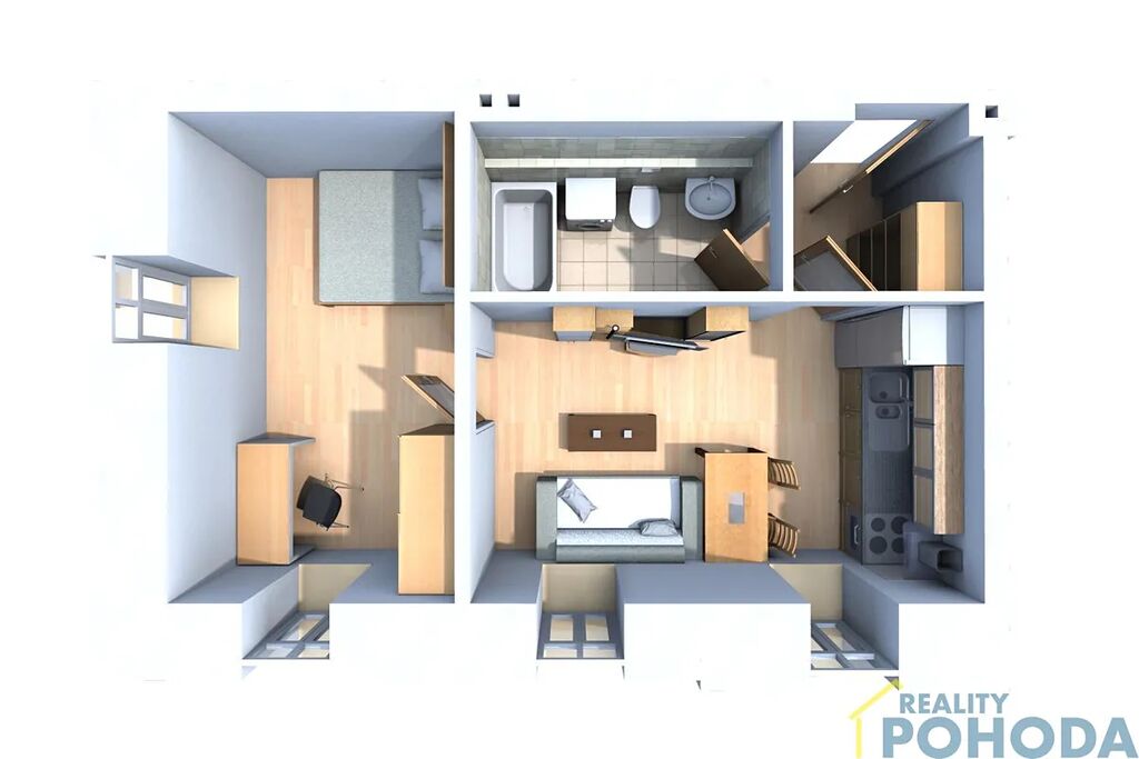 Byty tvoří vstupní chodba, obývací pokoj s přípravou na kuchyňskou linku (linka není součástí bytu) a ložnice. Dále je zde moderní koupelna společně s toaletou, vanou a praktickou nikou na odkládání koupelnových přípravků. Součástí moderní koupelny je také žebříkový radiátor, který se postará o příjemné teplo a komfort po každé vaší koupeli. Velká okna dodávají interiéru dostatek denního světla. Podlahy v přírodním dekoru podtrhují klidný charakter bytu.