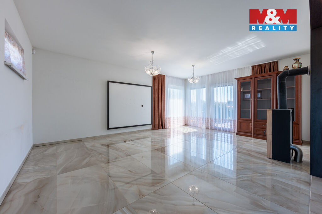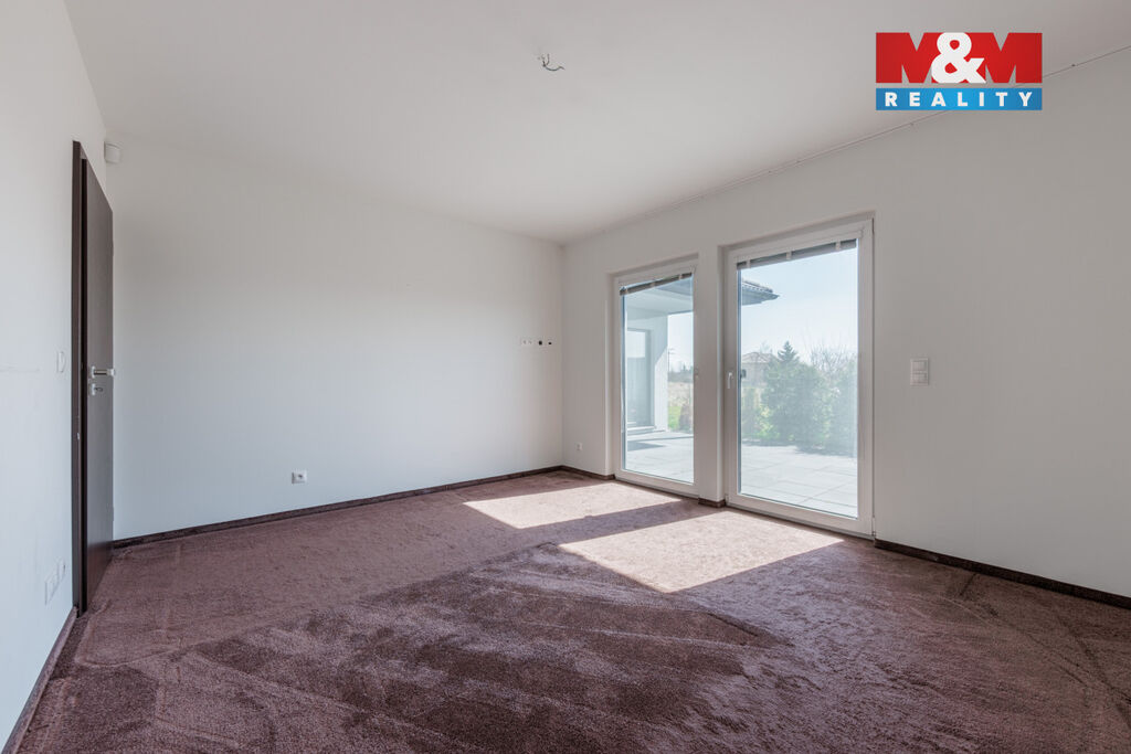 Dispozice: obývací pokoj s krbem, kuchyně na míru se značkovými spotřebiči, 3 samostatné pokoje, 2 šatny, koupelna, 2× WC, technická místnost, terasa 40 m².