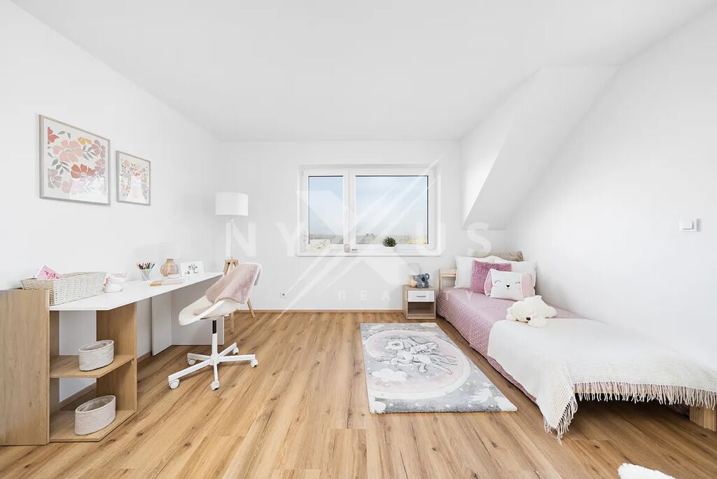 V prvním patře domu se nachází 4 samostatné pokoje, dvě koupelny (jedna s vanou i sprchovým koutem, druhá se sprchovým koutem náležící jednomu z pokojů - zamýšleno jako oddělený prostor pro hosty). Vchod na terasu (nacházející se nad garáží) z chodby v 1. patře.
