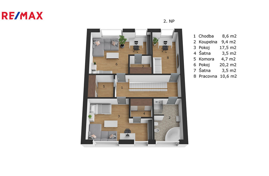 Dvoupodlažní dům o dispozicích 5+kk a celkové užitné ploše 168 m² a 17 m² terasy je umístěn v klidné časti obce v zástavbě nových rodinných domů.
