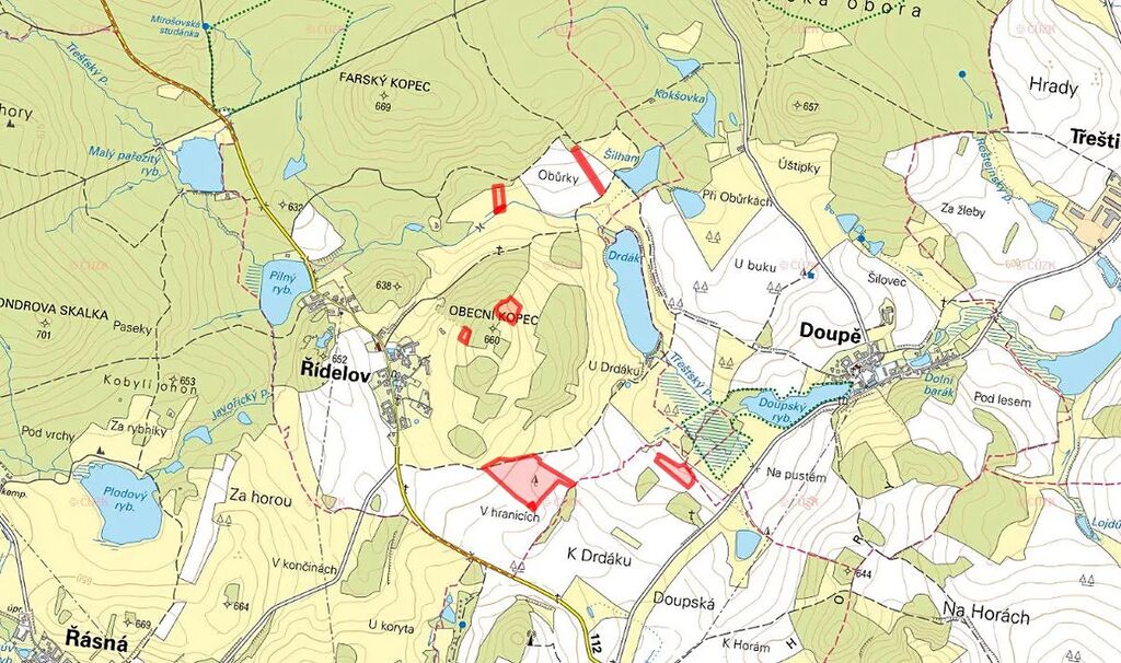 LV č. 104 v k. ú. Řídelov – parcely č. 13/11, 20/15, 28/50, 28/79, 248/2, 251, 371 a 415/9,