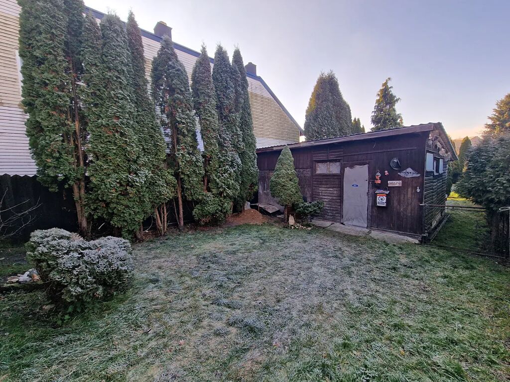 Za domem se nachází prostorná zahrada, se vzrostlými stromy. Na pozemku za domem instalována dřevěná kůlna, která je velmi zachovalá.