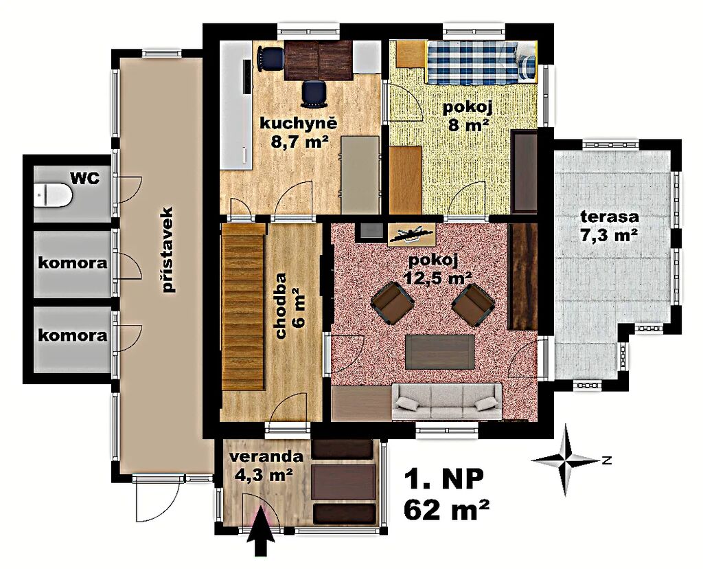 Stávající dispozice zahrnuje čtyři pokoje, kuchyni, komory a sociální zařízení, které již neodpovídá dnešním standardům. Velikou předností je pak prostorná terasa o velikosti 7,3 m2 a 18,5 m2 velký sklep.