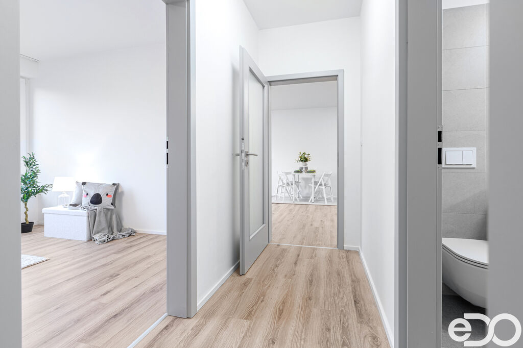 Byt se skládá z předsíně, obývacího pokoje s kuchyňským koutem, dvou samostatných ložnic (obě se vstupem na terasu), koupelny se sprchovým koutem a toaletou, další samostatnou toaletou s umyvadlem a rozměrné komory, která může sloužit jako šatna či jiný úložný prostor. Jednotka se nabízí nezařízená nábytkem. V nové kuchyni, která je vestavěná na míru, se nachází veškeré moderní spotřebiče značky Siemens: indukční varná deska s digestoří, elektrická trouba, mikrovlnná trouba, vestavěná myčka a vestavěná lednice s mrazákem. V koupelně je umístěna kombinovaná pračka se sušičkou značky Samsung. Plastová okna a terasové dveře zajišťují dobré tepelně-izolační vlastnosti. Vytápění je centrální, plynová kotelna se nachází přímo v domě. Celou nemovitost si můžete projít v pohodlí svého domova prostřednictvím virtuální prohlídky, která je součástí propagace.