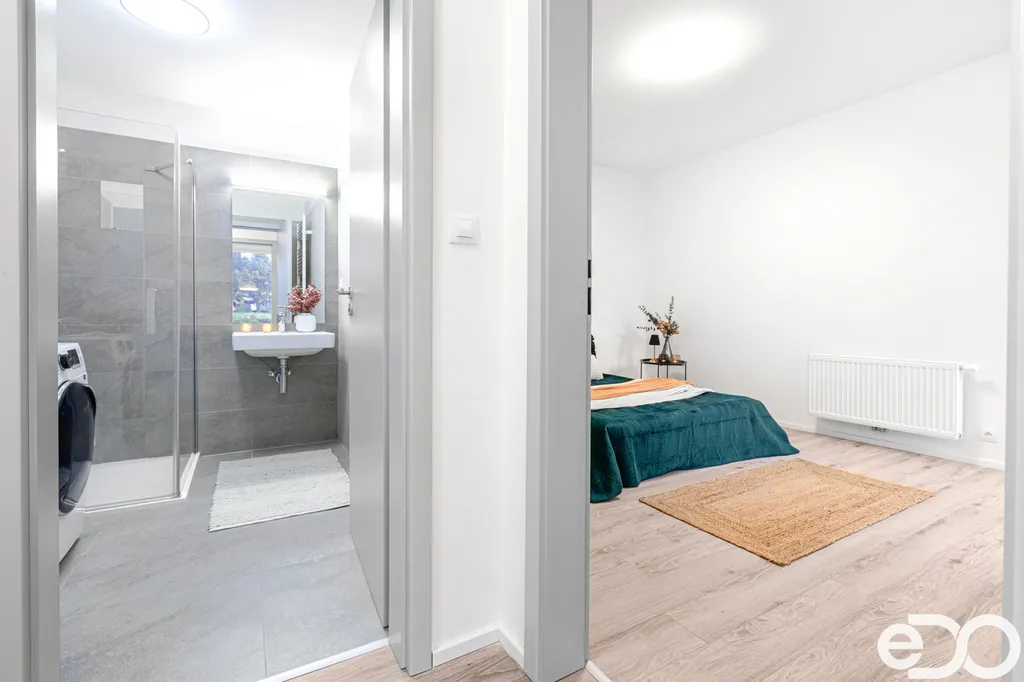 Jednotka se skládá z předsíně, obývacího pokoje s kuchyňským koutem, dvou samostatných ložnic (obě se vstupem na terasu), koupelny se sprchovým koutem a toaletou, další samostatné toalety s umyvadlem a rozměrné komory, která může sloužit jako šatna či jiný úložný prostor. Jednotka se nabízí nezařízená nábytkem. V nové kuchyni, která je vestavěná na míru, se nachází veškeré moderní spotřebiče značky Siemens: indukční varná deska s digestoří, elektrická trouba, mikrovlnná trouba, vestavěná myčka a vestavěná lednice s mrazákem. V koupelně je umístěna kombinovaná pračka se sušičkou značky Samsung. Plastová okna a terasové dveře zajišťují dobré tepelně-izolační vlastnosti, podlahy jsou laminátové plovoucí a keramická dlažba. Vytápění je centrální, plynová kotelna se nachází přímo v domě. Celou nemovitost si můžete projít v pohodlí svého domova prostřednictvím virtuální prohlídky, která je součástí propagace.