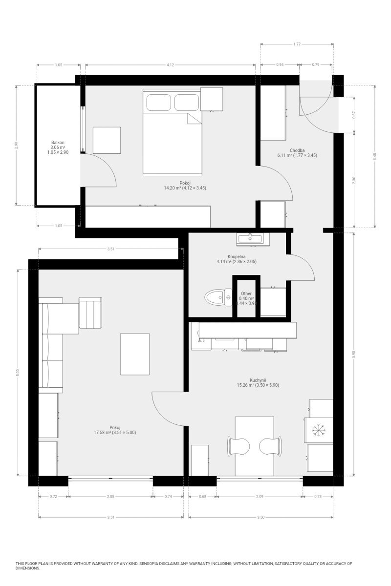 Byt se nabízí vybavený – vybavení zůstává dle fotografií. V kuchyni najdeme lednici, sporák s troubou, digestoř, myčku a lednici. Zbytek místnosti je vybaven jídelním stolem se židlemi. Koupelna disponuje sprchovým koutem, pračkou a umyvadlem se skříňkou. Toaleta je oddělena. V předsíni je praktická vestavěná skříň a lavice. Dva zcela oddělené pokoje jsou vybaveny vestavěnými skříněmi, gaučem, konferenčním stolkem, manželskou postelí a nočními stolky.