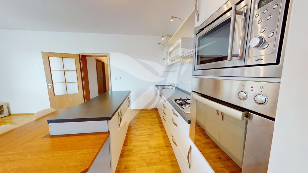 Byt se nabízí částečně zařízený, součástí je kuchyňská linka se spotřebiči ( vestav. trouba, MW trouba, plynová deska, myčka, digestoř a volně stojící lednice s mrazákem, dále je v pokoji obývací stěna, šatní skříň a regály v komoře.