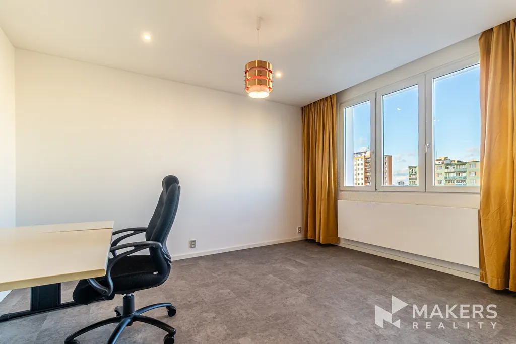Nabízíme k dlouhodobému pronájmu světlý, kompletně a kvalitně zrekonstruovaný byt 3+1 o celkové ploše 83 m², situovaný v 7. nadzemním podlaží z 8 revitalizovaného panelového domu s výtahem. Vyšší patro zajišťuje dostatek soukromí, klid a krásné otevřené výhledy do zeleně směrem na Lhotecký les včetně působivých západů slunce.