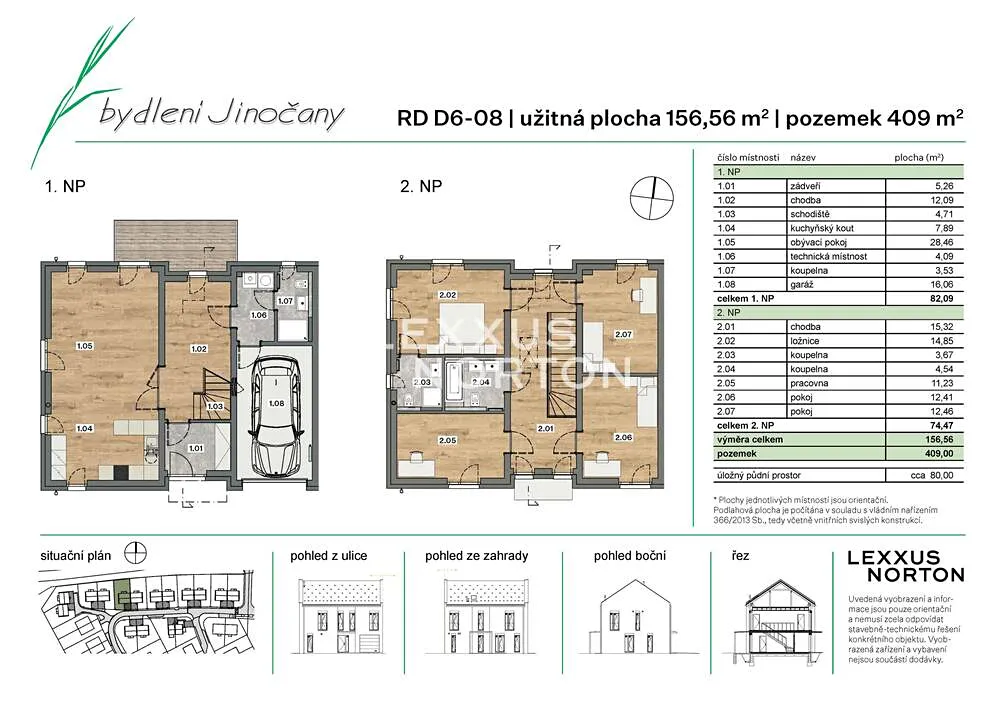 Dům s dispozicí 5+kk o celkové ploše 156,56 m² nabízí čtyři ložnice, tři koupelny, prostorný obývací pokoj s kuchyňským koutem, technickou místnost a dvě chodby. K domu náleží vlastní garáž, sedlová střecha s půdou a pozemek o velikosti 409 m².