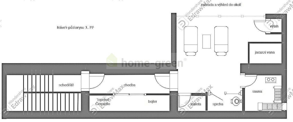 Dům je v původním stavu před rekonstrukcí, která může zcela proměnit jeho dispozici na nový domov ve stylu moderního bydlení, které vyhovuje jak mladým párům, tak i seniorům. V 1. NP lze umístit kuchyň, jídelnu , ložnici , koupelnu, WC a stávající prosklení střechy a okna na verandě nahradit celoroční zimní zahradou s posezením a krásným výhledem do okolí. V 1. PP pak vybudovat odpočinkovou zónu s výřivou vanou, saunou, sprchou a toaletou. Ve 2. NP je prostorná půda s možností vybudování bytu 3 + KK s užitnou plochou cca 80 m². Všechna tři podlaží lze propojit schodištěm a osobním výtahem. Viz ilustrační fotografie.