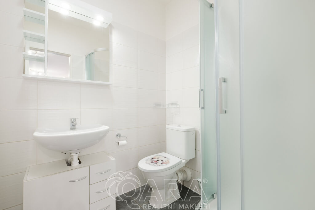 U vstupu do bytu se nachází věšáková stěna. Koupelna je vybavena zrcadlovou i umyvadlovou skříňkou, novým sprchovým koutem s vaničkou a elektrickým podlahovým vytápěním. Hlavní obytná místnost s kuchyňským koutem je vybavena moderní kuchyňskou linkou se sklokeramickou varnou deskou, digestoří, úložnými skříňkami a přípravou pro pračku. V bytě je instalováno řízené větrání s rekuperací tepla, které zajišťuje úsporné a zdravé vnitřní prostředí. Vytápění bytu je zajištěno centrálním plynovým kondenzačním kotlem v domě, ohřev teplé vody zajišťuje vlastní elektrický bojler. Parkování je možné na veřejných parkovacích místech před domem.