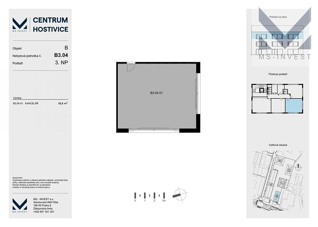 Nabízíme komerční jednotku o ploše 53 m2 ve 3. NP (č. B 304 ) v novostavbě projektu Centrum Hostivice s výtahem. Možné využití: kancelář, obchod, ordinace, apod. Prostor je rohový, velká okna zajištují maximální přísun přirozeného světla, proti slunci jsou naistalovány hliníkové předokenní žaluzie, ve standardu je dále příprava na klimatizaci, podlahové vytápění a další. Jednotky v posledním 3. NP mají vysoké stropy (3,8 m) které umožnuji si pohrát s interiérem a ještě lépe využít nabízený prostor. Objekt B je situován v samém centru Hostivice, s výhledem na Husovo náměstí, zámek a Kostel Sv. Jakuba, u autobusové zastávky a dále u hlavního vstupu do projektu, je tedy velmi vhodný pro komerční využití. Nebytové prostory budou dokončeny ve stavu shell and core, jako tzv. rozestavěná jednotka. Kolaudaci si potom klient řeší sám dle jeho konkrétního způsobu využití komerčního prostoru. Dokončení výstavby je plánované na podzim roku 2025