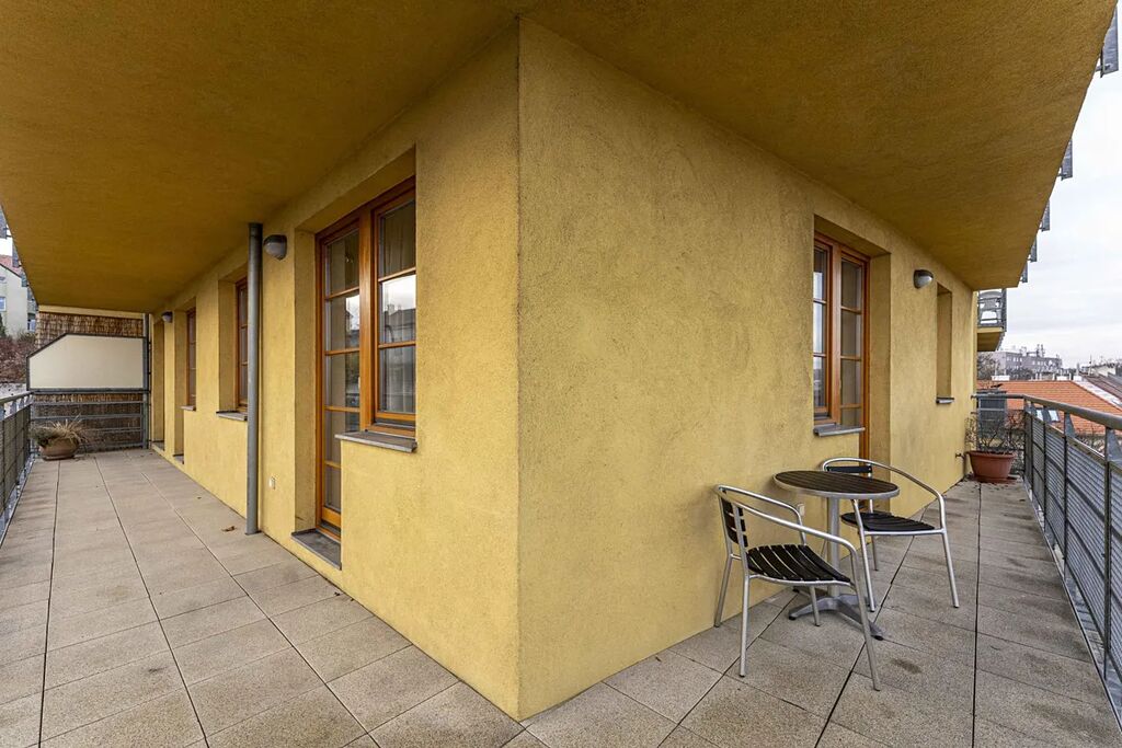 Byt obklopuje ze všech stran terasa s krásnými výhledy na okolní Břevnov, celkem i s terasou má byt cca 110 m2.