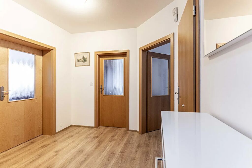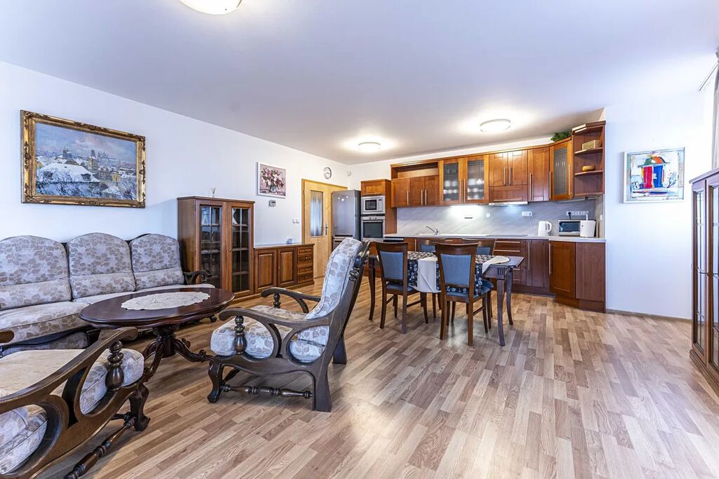 Dispozice: vstupní chodba se vstupy do 2 ložnic, technické místnosti vybavené pračkou i sušičkou, obývacího pokoje s kuchyňskou linkou zařízenou běžnými spotřebiči.