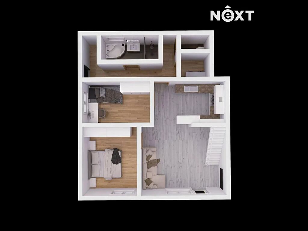 Nyní jsou obě poloviny ve stavu vyžadující kompletní rekonstrukci. A můžou vypadat právě tak, jak vidíte na těchto fotkách. Ty jsou z identického dvojdomku, respektive z jeho poloviny, která už má realizaci za sebou. Budoucí dispozice každé poloviny může být řešena jako 3+kk s dvěma horními prostory.