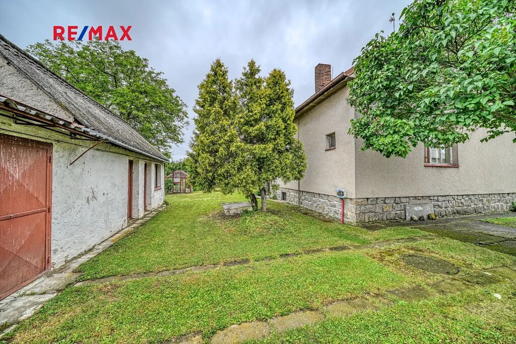 Na zahradě jsou vzrostlé stromy, garáž s dílnou a skleník. Je zde dostatek prostoru pro zahradničení, odpočinek nebo vybudování bazénu a posezení.