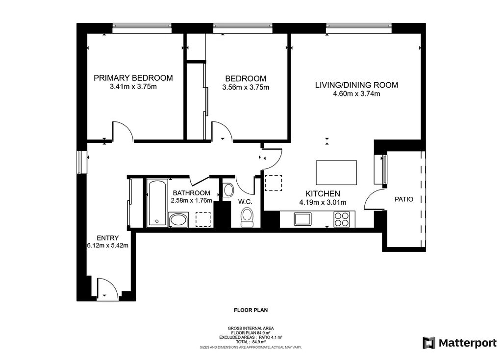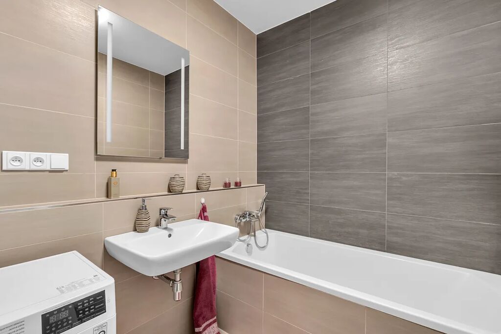 Dispozice zahrnuje vstupní chodbu s vestavěnou skříní, samostatné WC s umyvadlem, koupelnu s vanou a přípravou na pračku a sušičku, dětský pokoj, ložnici s vestavěnými skříněmi a obývací pokoj s kuchyňským koutem a vstupem na zasklenou terasu. Kuchyň je vybavena vestavěnými spotřebiči.