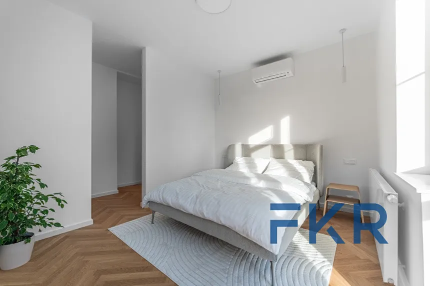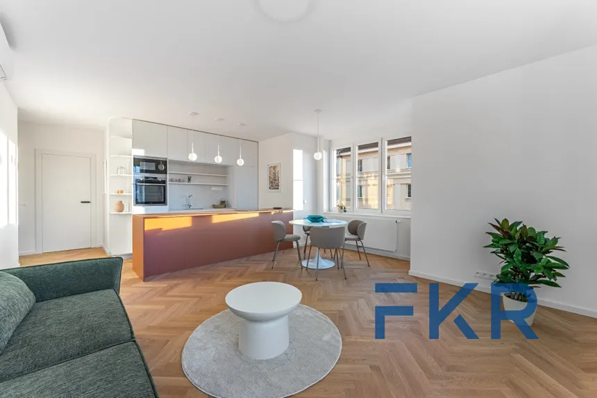 Byt nabízí trendy koncepci hlavní obytné zóny (33 m²) propojené s kuchyní a samostatně oddělených částí, které zajišťují vyšší míru soukromí, komfortu a klidu.
