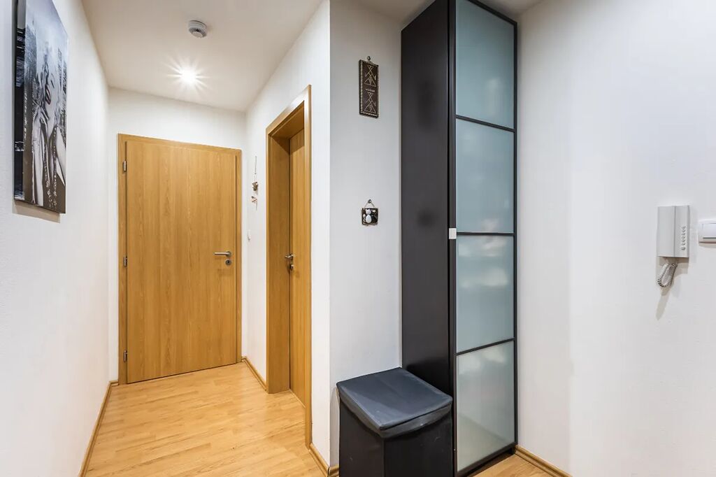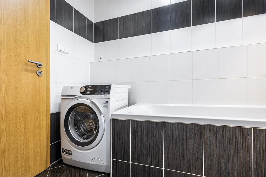 V bytě je předsíň, prostorná koupelna s WC (vana, umyvadlo, WC, otopný žebřík, koupelnový nábytek na míru, ventilátor a místo pro pračku), útulná ložnice, světlý obývací pokoj s kuchyňským koutem - moderní kuchyňská linka z kvalitních materiálů od firmy Čížek kuchyně + skříně na míru s vestavěnými spotřebiči Siemens (lednice s mrazákem, indukční varná deska, myčka nádobí, elektrická trouba vč. mikrovlnné trouby, výkonný odpařovač, LED podsvícené části kuchyně, granitový keramický dřez Franke, baterie Franke). Z obývacího pokoje je přímý vstup na terasu a do zahrady. Terasa je osvětlená a je zde nezámrzný ventil užitkové vody. Všechna okna i terasa jsou situovaná do klidné části ulice.