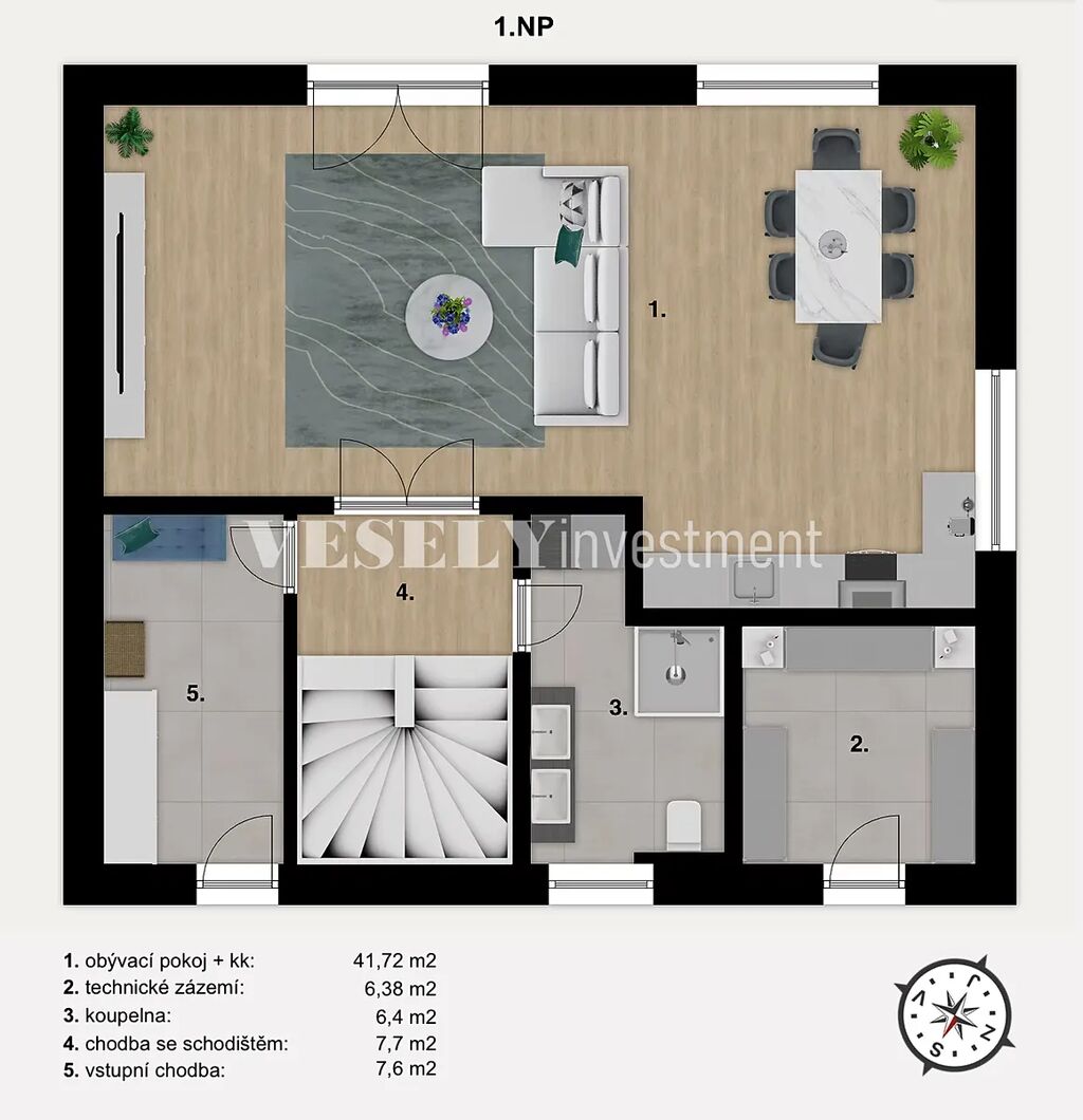 Vstup do domu tvoří vstupní chodba (7,6 m2) se vstupem do chodby se schodištěm (7,7 m2), ze které se dostanete do 2NP. Z chodby jsou dále vstupy do velkorysého obývacího pokoje s kuchyní (41,72 m2) a koupelny se záchodem (6,4 m2). V 1.NP se také nachází technická místnost (technické zázemí), která má vlastní vstup z pozemku.