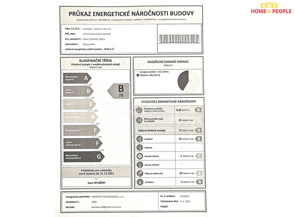 Zprostředkujeme Vám výhradní pronájem nového bytu o dispozici 2+KK o celkové ploše 78 m² (BYT 58 m² + TERASA 20 m² + GARÁŽOVÉ STÁNÍ V DOMĚ). Byt se nachází ve čtvrtém nadzemním podlaží (3. patro) čtyřpodlažního nového domu s výtahem ve městě Slaný, v ulici Lázeňská. Byt je v osobním vlastnictví, nikdy nebyl ještě obýván. Disponuje ložnicí, obývacím pokojem s kuchyní, předsíní, prostornou šatnou, koupelnou s vanou a toaletou. Z obývacího pokoje a ložnice je možno vstoupit na vlastní prostornou terasu s výhledem k jihu do zeleně. V suterénu domu je k dispozici vlastní kryté garážové stání. V bytě je následující vybavení: kuchyňská linka se spotřebiči - lednice, myčka, digestoř, el. sporák s el. troubou, pračka, televize, postel, skříně, stůl židle, osvětlení atd.. Nová plastová okna s roletami směřují k jihu na terasu s výhledem do zeleně okolo domu, v bytě jsou umístěny nové radiátory, na podlaze je položena plovoucí podlaha a dlažba. Bytový dům byl kolaudován v roce 2023 - průkaz energetické náročnosti budovy - třída B, společenství vlastníků velmi dobře funguje. V domě je zaveden ústřední ohřev vody a tepla, Internet je zaveden. Správa domu velmi dobře funguje. Parkování je rovněž bezproblémové v okolí budovy. V dané lokalitě je veškerá občanská vybavenost, zejména - škola, školka, kostel, kino, restaurace, lékař, lékárna, pošta, nákupní středisko. Je zde krásné a klidné bydlení v zeleni blízko centra města. Dopravní obslužnost - 20 min od Letiště Václava Havla. Rezervace možná ihned, k nastěhování ihned!!! Doporučujeme osobní prohlídku, jedná se o komfortní a klidné bydlení vhodné pro rodiny s dětmi, popř. pro pracovníky letiště. Velmi doporučujeme osobní prohlídku!! Ev. číslo: 32013.