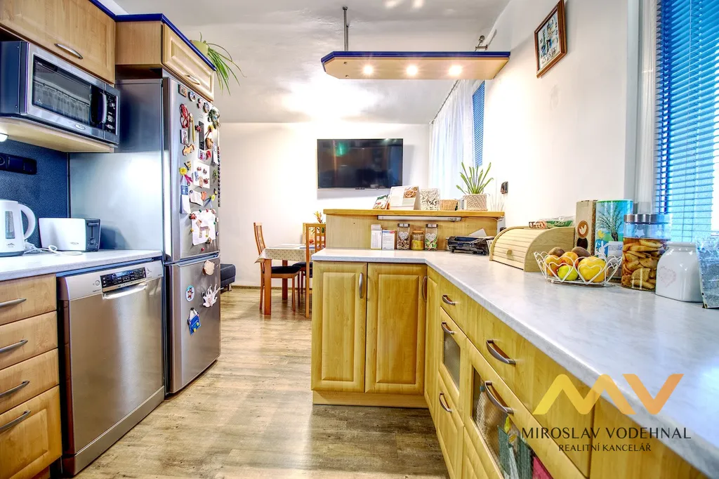 Současná dispozice vznikla úpravou původního bytu 4+1 a nabízí moderní řešení s kuchyní ve tvaru U vybavenou spotřebiči, která je propojena s prostorným jídelním koutem využitelným i jako menší obývací prostor. Z centrální předsíně s na míru vyrobenými úložnými prvky je vstup do obývacího pokoje se vstupem na rozměrnou lodžii s příjemným výhledem do okolí, dále do dětského pokoje a ložnice, které jsou vybaveny vestavěnými skříněmi. Koupelna se zděným jádrem nabízí komfort vany i sprchového koutu, toaleta je samostatná. Součástí bytu je také praktická komora s regály a v suterénu umístěná sklepní kóje o velikosti 3 m², v domě je navíc společná kolárna.