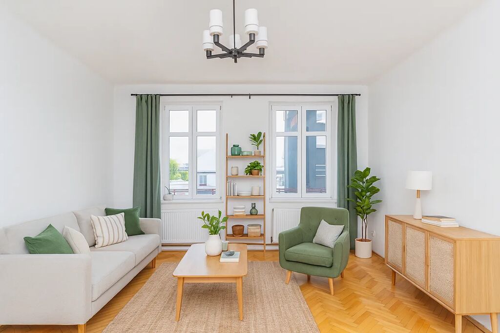 Jednotka si zachovala původní prvorepublikový charakter – dřevěné podlahy, renovované interiérové dveře a vysoké stropy (3,10 m) dodávají bytu jedinečnou atmosféru.