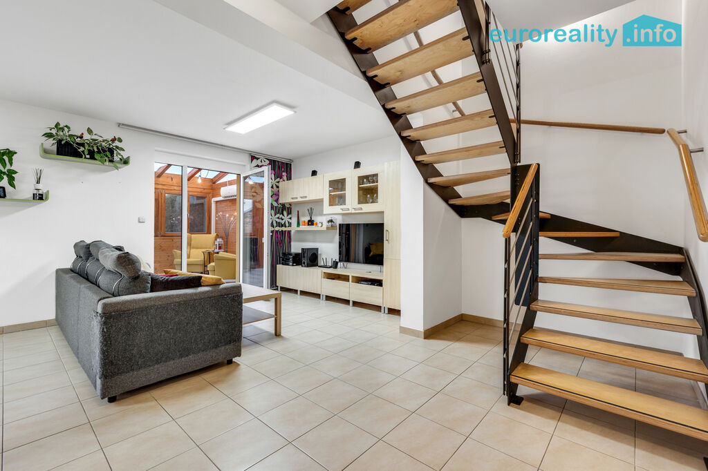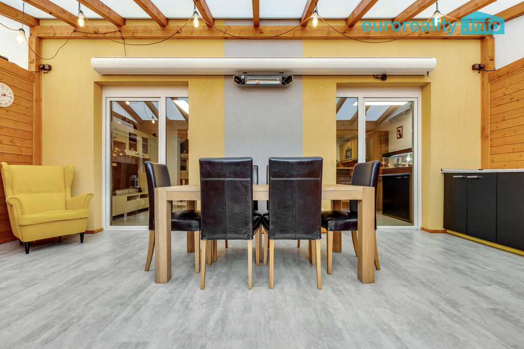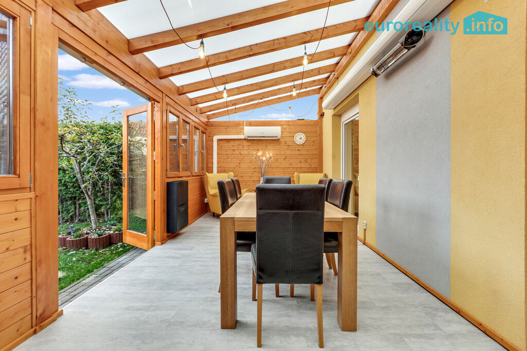 Přízemí: obývací pokoj s jídelnou (32 m²) a kuchyňským koutem (5 m²), kde se vaří i ty nejlepší nedělní řízky. K tomu koupelna se sprchovým koutem, technická místnost, zádveří a jako bonus zimní zahrada (21 m²) – celoročně obyvatelná, s klimatizací, ideální na grilovací afterparty nebo zimní čtení s čajem, nebo každodenní posezení s rodinou.