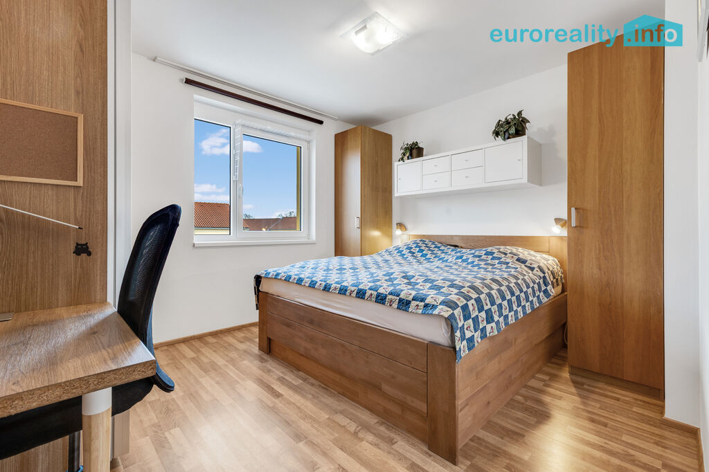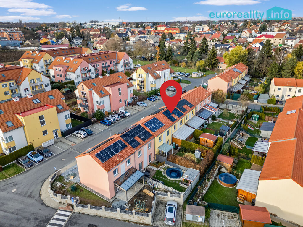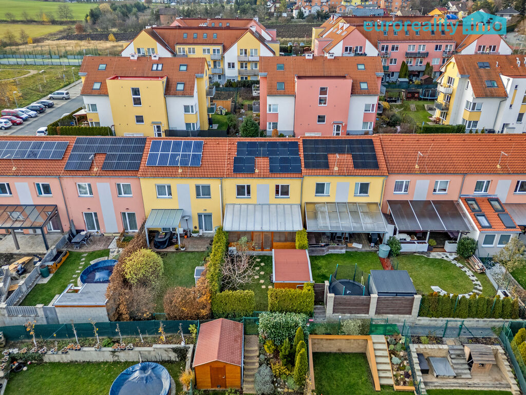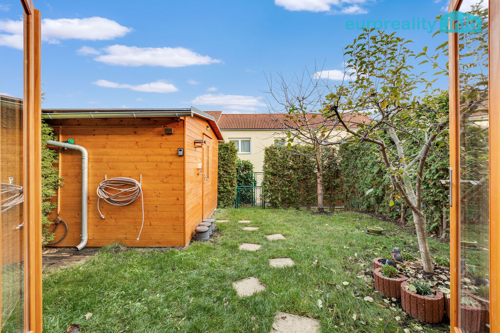 Exteriér: vlastní pozemek 52 m2 před domem, dvě parkovací stání pro větší auta, místo pro tři motocykly a stojan na kola. A ještě zahradní domek (8,75 m²), který zvládne být úložným prostorem i malou dílnou.