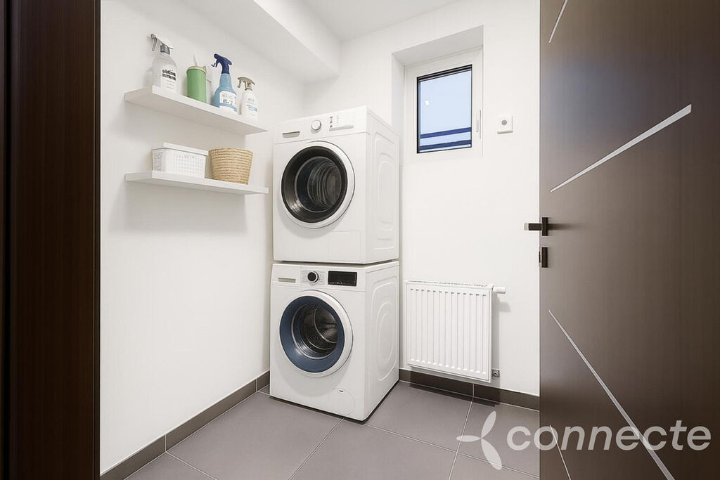 - Technická místnost (2,7 m²) s přívodem vody a odpadem: pračka a sušička mimo obytné prostory.