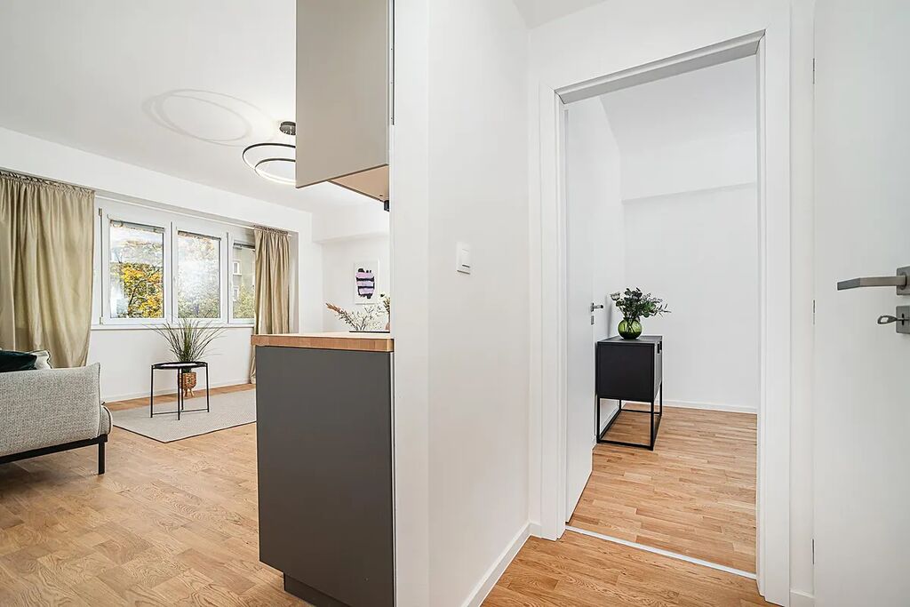 Byt právě prochází kompletní rekonstrukcí, která zahrnuje nové rozvody elektřiny, vody a odpadů, moderní podlahové krytiny, nové obklady a sanitu.Součástí vybavení je kuchyňská linka na míru se spotřebiči prémiové značky Bosch. K dispozici je také návrh kuchyně pro lepší představu o jejím finálním vzhledu.