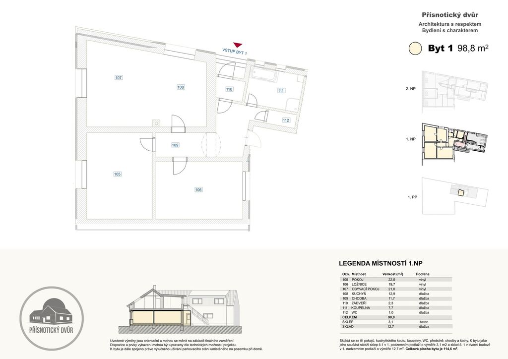 Rádi Vám představujeme moderní projekt Přísnotický dvůr, který nabízí tři ojedinělé bytové jednotky v malebné obci Přísnotice na jižní Moravě. Dům s pouhými třemi byty vytváří klidné, komorní prostředí a nachází se v centru obce, při ulici Žabčická – Přibická. Díky výborné dostupnosti do Brna a Židlochovic jde o místo, které dlouhodobě přitahuje zájemce o kvalitní, tiché a pohodlné bydlení. Každý z bytů nese jméno inspirované historií obce – Bartoloměj, Florián a Urban. Nabízená jednotka Urban je situována v přízemí domu.