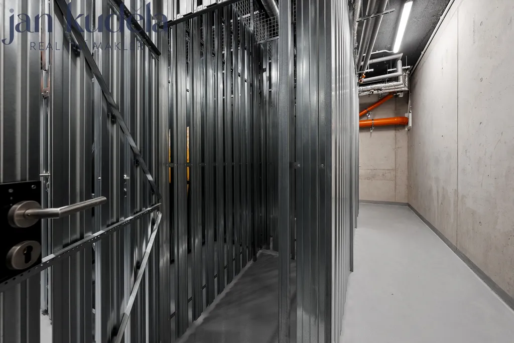 Byt je tvořen obytnou místností s kuchyňským koutem a vstupem na předzahrádku, dále koupelnou se sprchovým koutem a toaletou. K bytu náleží také sklepní kóje. Možnost pronájmu parkovacího místa přímo v domě.