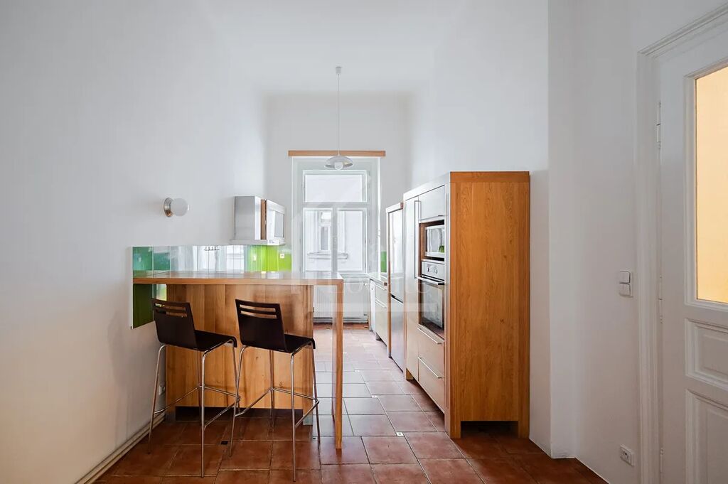 Atraktivitu bytu zdůrazňují vysoké stropy přes 4 m a krásná repasovaná velká okna. Byt je částečné zařízený (vestavěné skříně, nábytek ..). Částečná rekonstrukce proběhla před pár lety (nový plynový kotel, kuchyň, broušení parket).