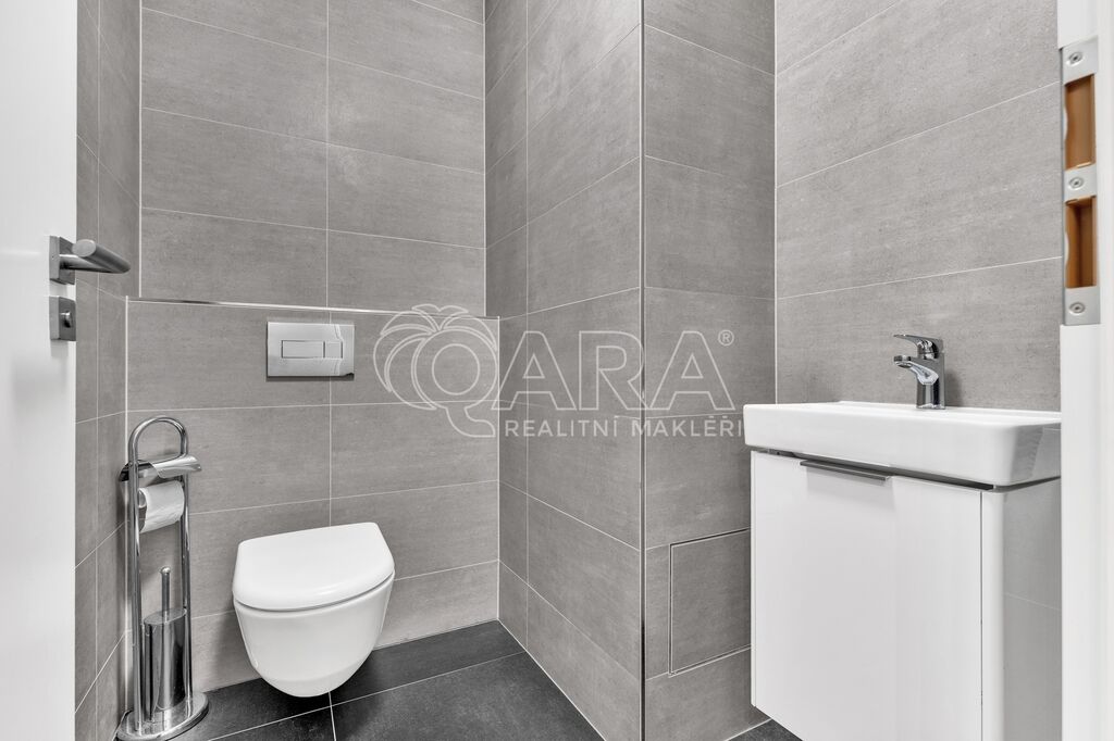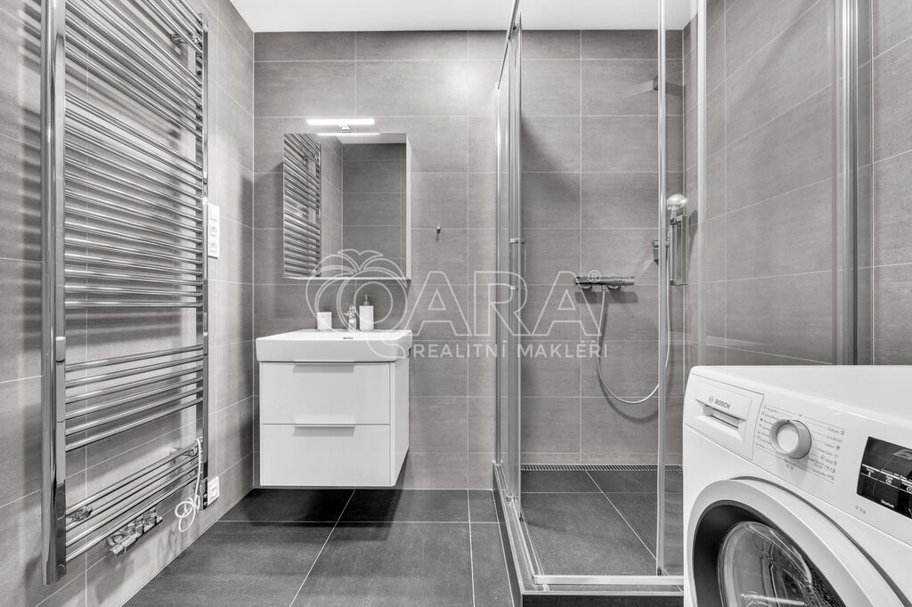 Koupelna je vybavena sprchovým koutem, pračkou Bosch, umyvadlem; toaleta je samostatná. Ložnice disponuje manželskou postelí a prostornou walk-in šatnou, která poskytuje dostatek úložného prostoru.