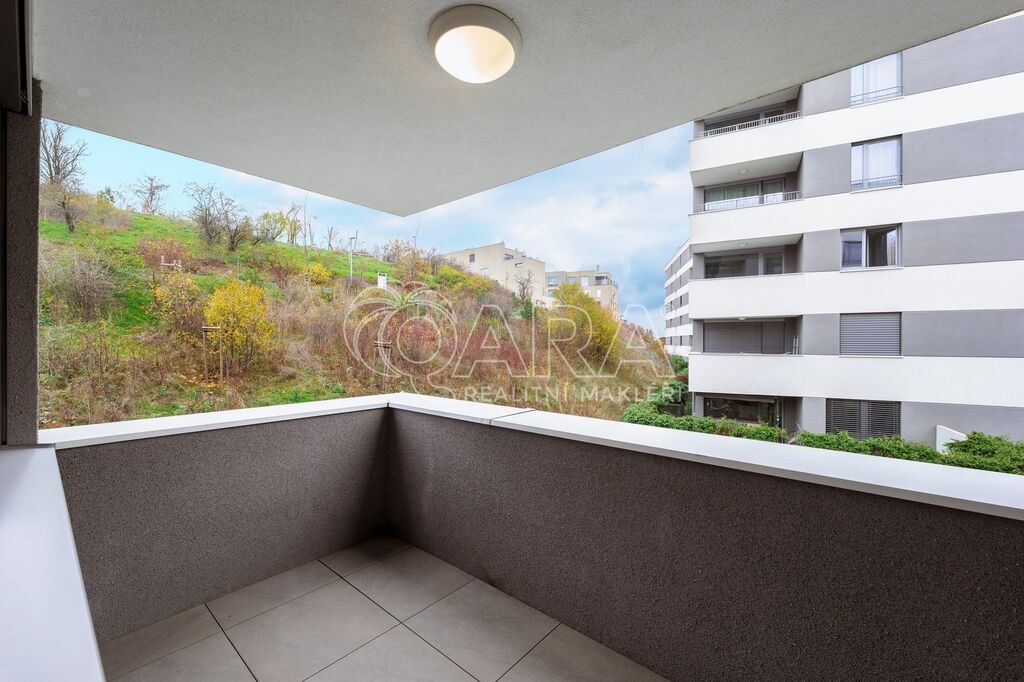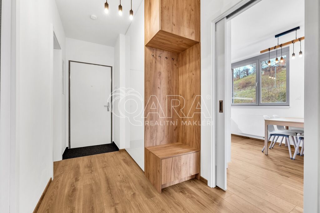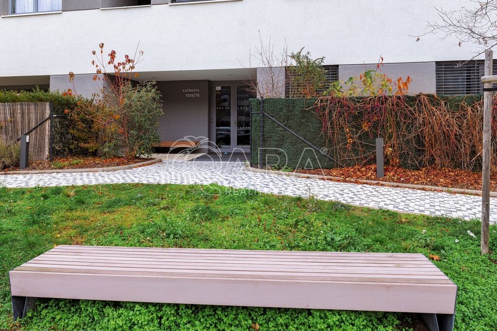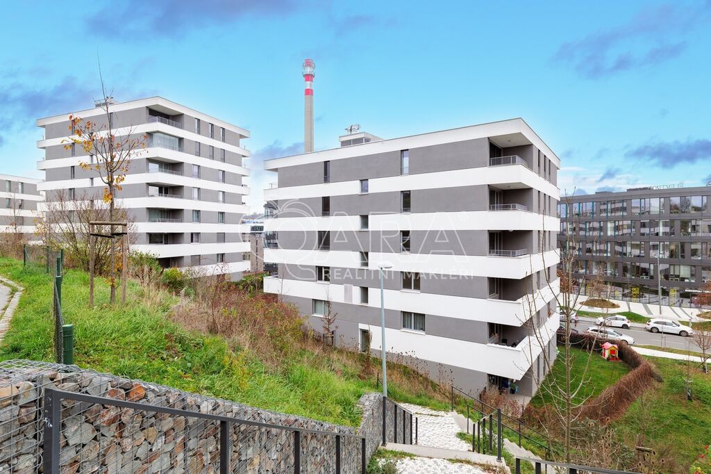 Byt se nachází ve 3. nadzemním podlaží novostavby s výtahem a kamerovým systémem. Dispozice zahrnuje vstupní chodbu s vestavěnými skříněmi, kompletně vybavenou kuchyňskou linku značky Hanák se spotřebiči AEG, obývací pokoj orientovaný do zeleně a prostornou lodžii situovanou do klidné části.