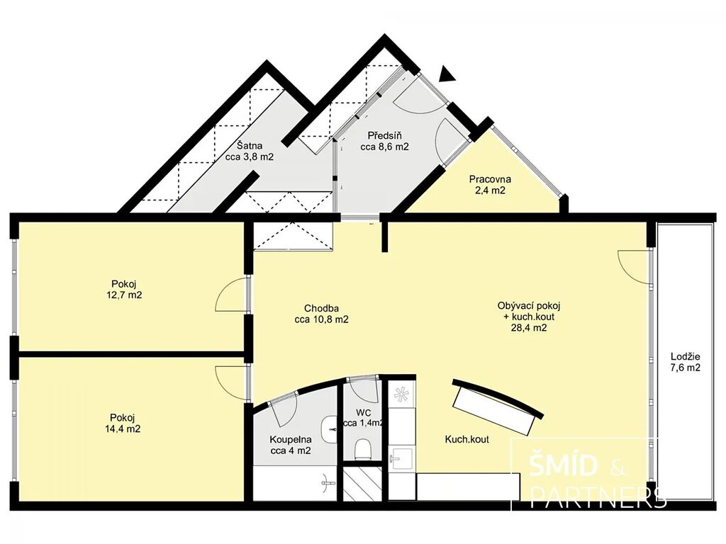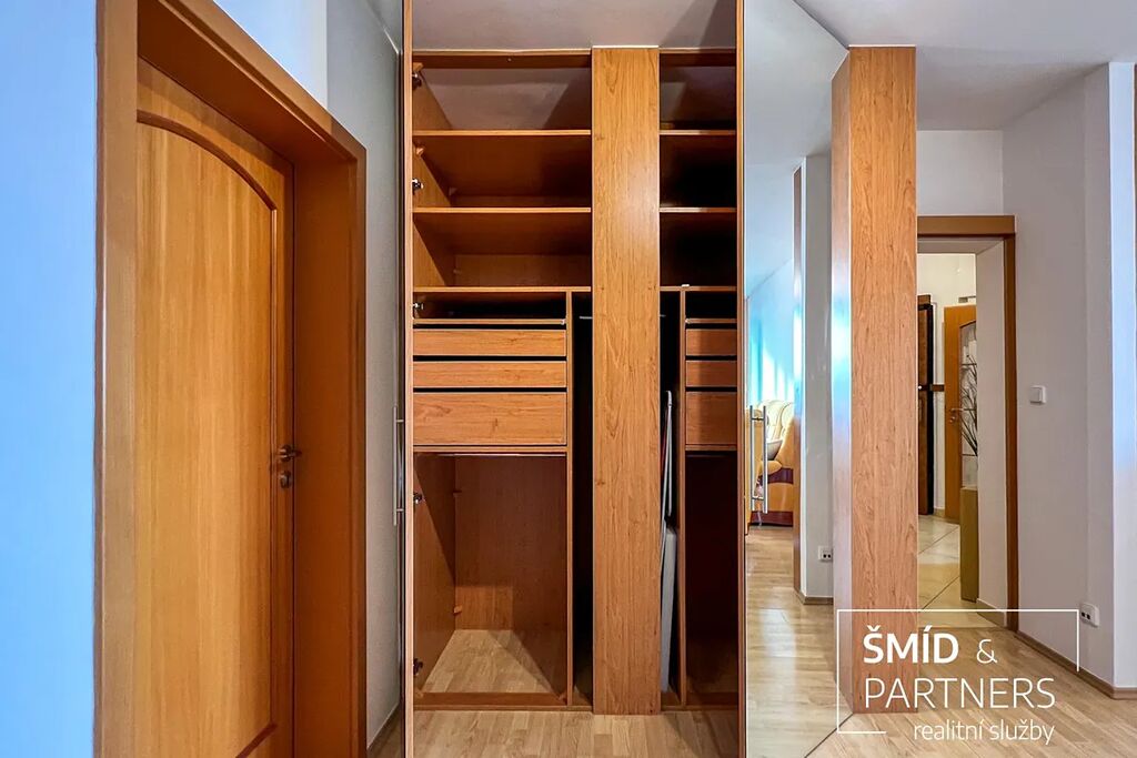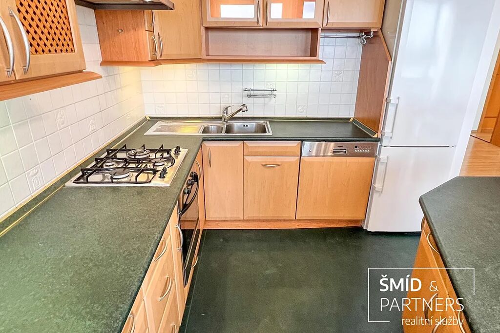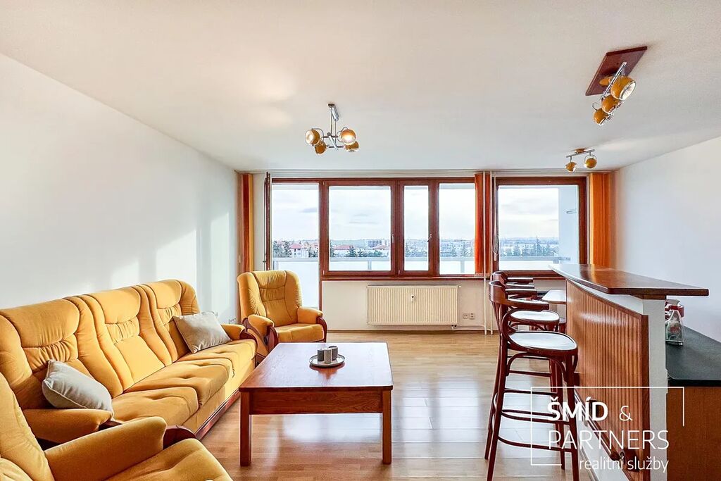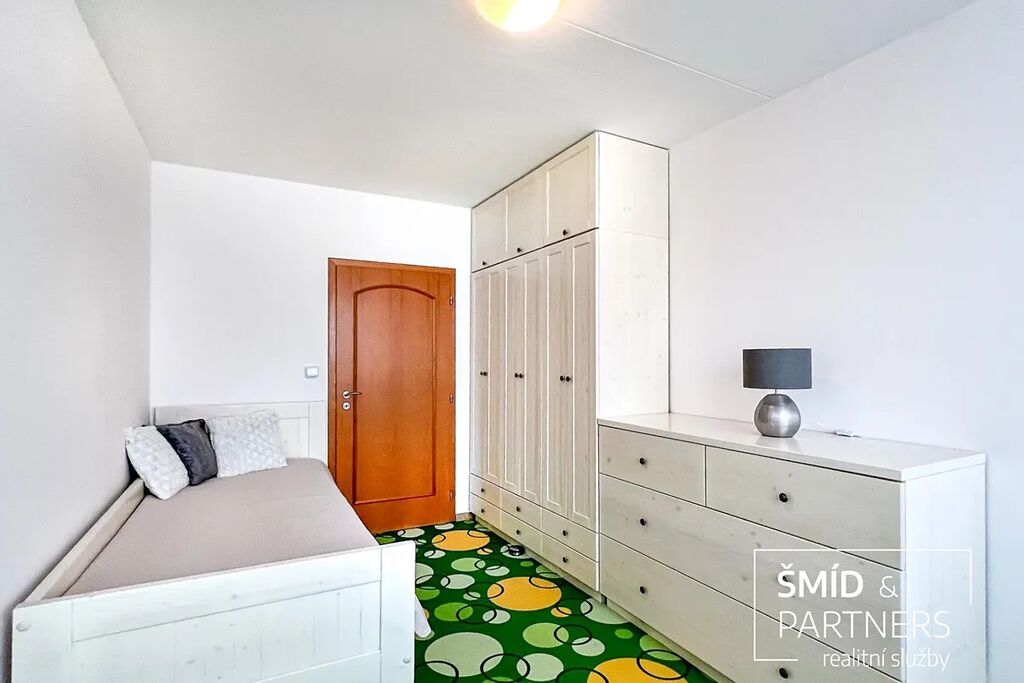 K prodeji nabízíme velmi hezký byt 3+kk o velkorysé ploše téměř 90 m2 a s lodžií o ploše cca 8 m2. Byt se nachází v 5. NP sedmipodlažního bytového domu v ulici Amforová v pražských Stodůlkách. Byt disponuje velkorysým obývacím pokojem s kuchyňským koutem a skutečně velkými a prakticky řešenými úložnými prostory, které jsou přístupné ze vstupní chodby a elegantně skryté za posuvnými dveřmi. Vybaveny jsou na míru zhotovenými vestavěnými skříněmi a policovým systémem. U vstupní chodby se nachází jedna z původních lodžií, která je nyní, po zasklení, přeměněna v malou pracovnu. Za posuvnými dveřmi oddělujícími vstupní chodbu od centrálního prostoru vpravo se nachází dvě ložnice a naproti se nalézá koupelna a samostatná toaleta. Centrální místnost má téměř čtyřicet metrů čtverečních a je krásně prosvětlena okny v celé šíři místnosti. Díky své velikosti je zde dost místa pro prostornou kuchyňskou linkou s ostrůvkem a barem, jídelním koutem a obývací částí vybavenou třídílnou sedací soupravou. V této místnosti je vstup na lodžií. Koupelna a toaleta je situována v and #34;poloeliptickém and #34; vnitřním jádru s dveřmi pootočenými směrem k ložnicím a chodbě s dalšími vestavěnými skříněmi. Toto řešení poskytuje jistou dávku intimity a jsou tak opticky méně exponované obytnému pokoji. Tvar vnitřní poloeliptické příčky je následně propsaný do zakřiveného kuchyňské ostrůvku. Toto designové řešení vnáší do interiéru velmi zajímavé pojetí, které je mimo jiné velmi praktické, a dovolilo tak koupelně a toaletě získat cenné čtvereční decimetry. Dvě souběžné ložnice jsou výhledem do vnitřní zástavby opět prosvětleny velkými okny a jejich velikost plně splňuje svůj účel hlavní ložnice a dětského pokoje. Dalším velmi netradičním prvkem bytu je instalace dvojtónových dřevěných eurooken. Z venkovní části jsou opatřena bílým nátěrem a zevnitř je na rámech zachována kresba dřeva. Díky tomu, spolu s dřevěným nábytkem, kuchyňskou linkou, plovoucí podlahou, barvou dveří a detailů jako jsou dřevěné parapety a obložky, byt rozhodně nepůsobí dojmem starší panelové zástavby. Kuchyňský kout je jedním slovem velký, což ocení zejména ti, kteří tráví v kuchyni hodně času ať už ze záliby, či z potřeby nasytit rodinu. Linka je vybavena plynovou varnou deskou, horkovzdušnou troubou, myčkou nádobí, kombinovanou chladničkou a nezbytnou digestoří. Koupelnu s vanou se sprchovou zástěnou ocení zastánci sprchování i milovníci vany. Místo se zde našlo i pro automatickou pračku. Toaleta je samostatná a v její zadní části se tradičně nachází přístup do stoupaček.