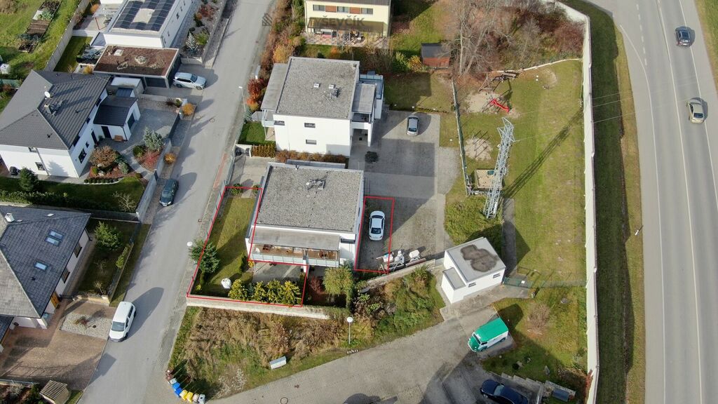 Součástí prodeje je také sklepní kóje 5 m² a parkovací stání pro dva automobily přímo u domu. Celý pozemek je uzavřený a sdílí jej pouze šest vlastníků dvou totožných bytových domů s vlastním společným vjezdem, což zajišťuje pocit bezpečí a soukromí.