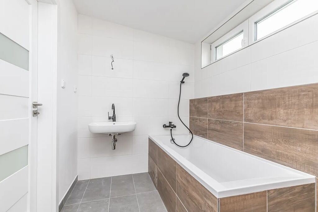 Dům je vytápěn podlahovým topením, je napojen na veřejný vodovod a kanalizaci. Dešťová voda je kumulována do dešťové jímky a je určena pro zalévání zahrady. Nabízený dům je bez kuchyňské linky a podlahových krytin.