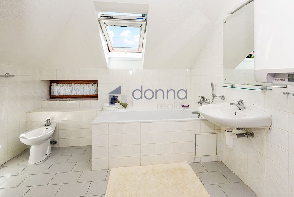 V patře je druhá koupelna s vanou, bidetem a toaletou a také komora (6m²). Velká terasa orientovaná na východ i západ poskytuje nádherné výhledy a naprosté soukromí.